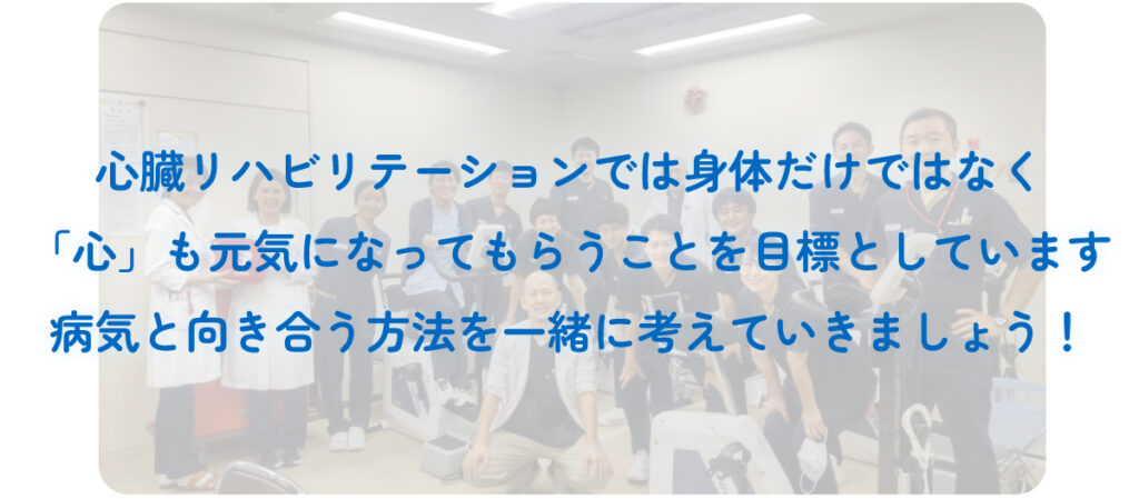 循環器内科医師を中心に専門医療職が患者様一人ひとりの心臓機能の状態と生活に応じた効果的なリハビリプログラムを提案し、患者様の支えとなりたいと考えています。ご興味のある方は是非一緒にはじめてみましょう。