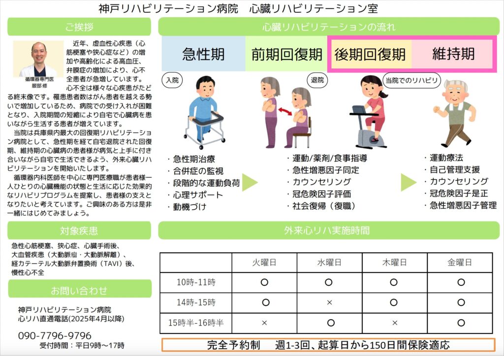 当院は兵庫県内最大の回復期リハビリテーション病院として、急性期を経て自宅退院された回復期、維持期の心臓病の患者様が病気と上手に付き合いながら自宅で生活できるよう、外来心臓リハビリテーションを実施しております。