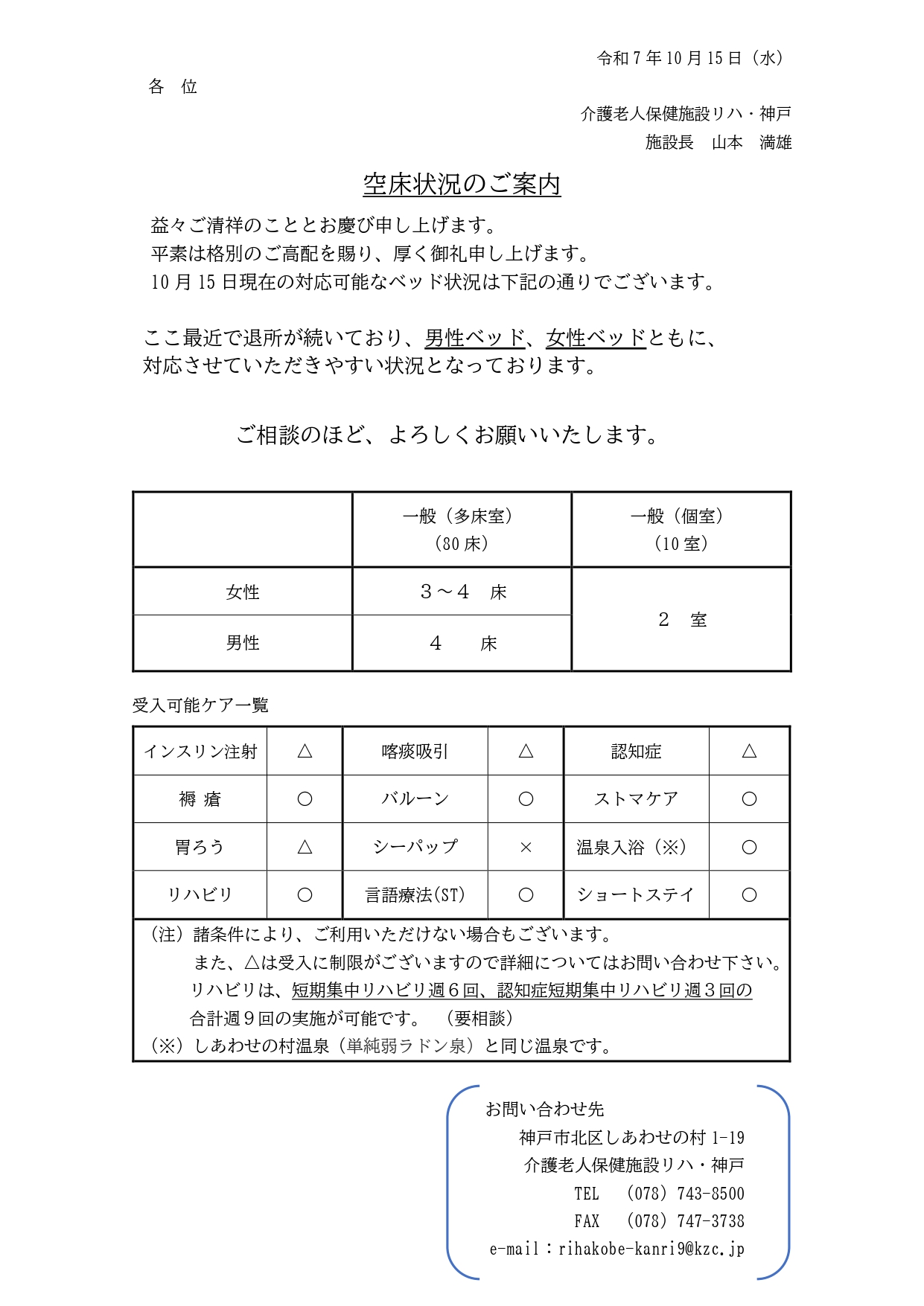 令和7年10月15日 空床情報